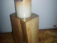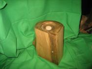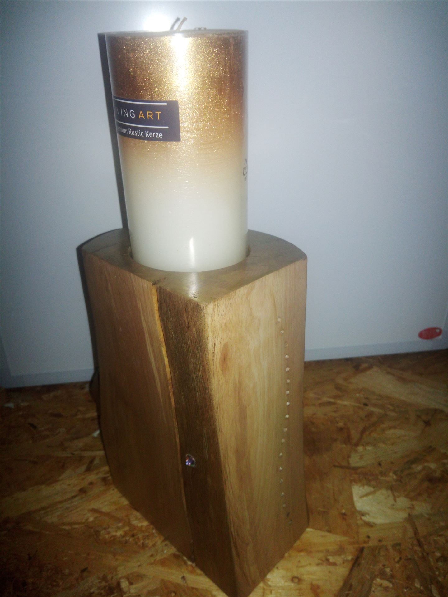 Dieser Kerzenständer ist aus Buchenholz gefertigt, poliert und gewachst. Ein leichter Hauch von Vintage-Goldwachs veredelt seine Erscheinung. Eine verschließbare Kernbohrung bietet Raum für Kräuter und Gewürze, die ihren Duft dezent über die seitlichen Bohrungen abgeben.