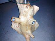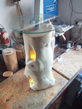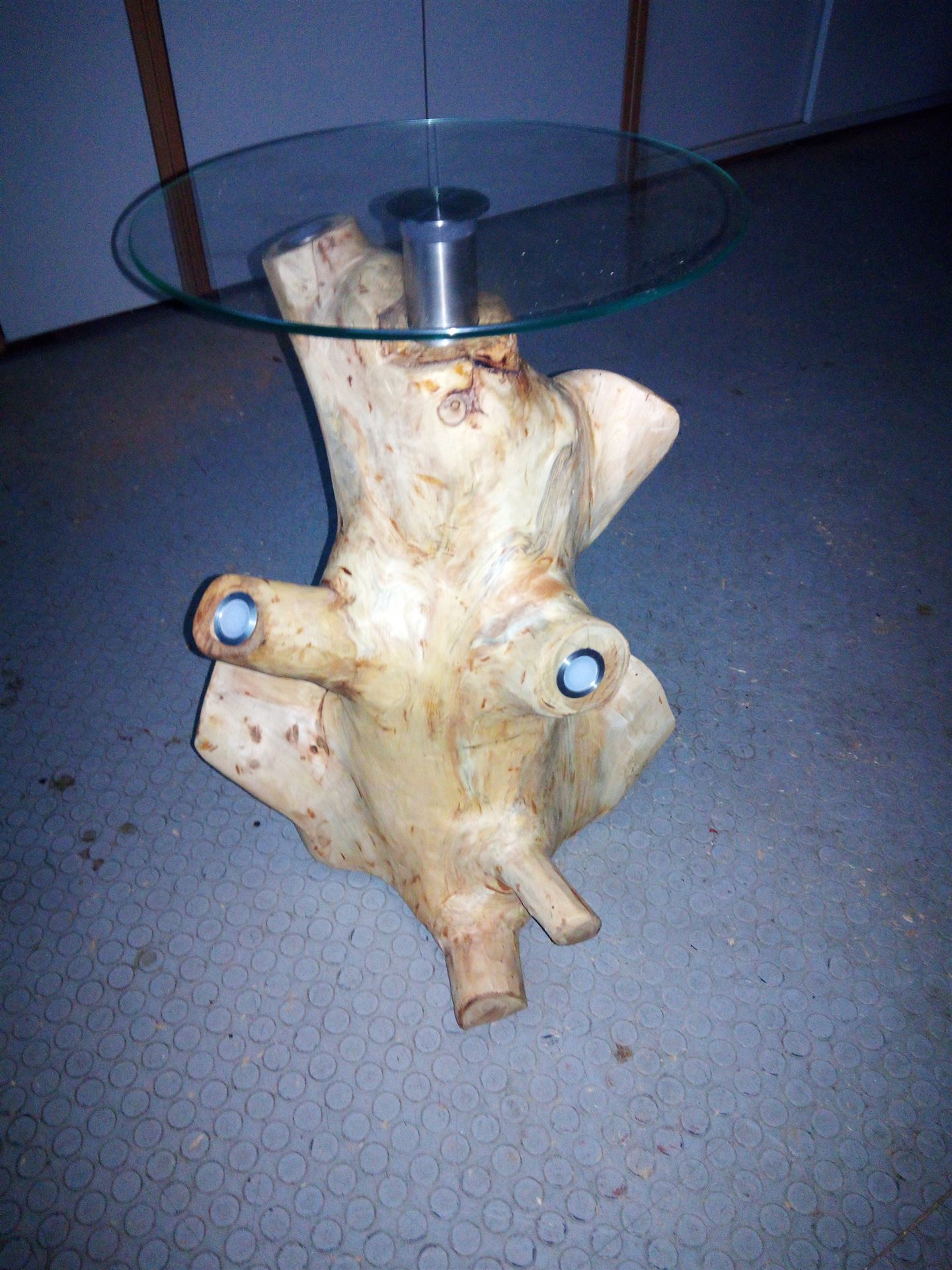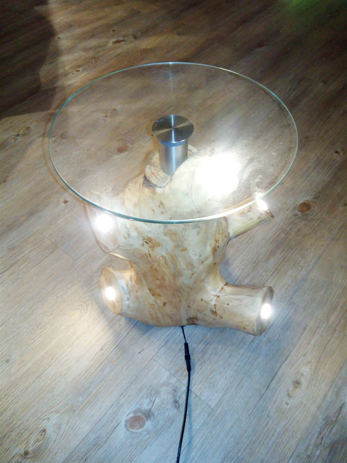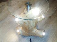 Dieser Beistelltisch wurde aus einem mind. 2 Jahre abgelagerten Fichtenstamm aufwendig gefertigt. An den Astenden sind sechs LED-Strahler eingebaut, die über das Stamminnere verkabelt wurden. Die Oberfläche wurde geschliffen und mit Wachs versiegelt.