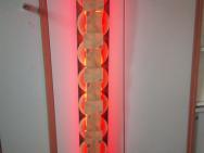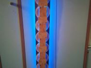 Die indirekte Beleuchtung des Vorderbereichs und ein nach hinten ausgerichteter Leuchtstreifen ermöglichen eine effektvolle Beleuchtung. Das Farbspiel ist wechselbar und dimmbar. Diese Leuchte ist stehend oder durch Befestigung an einer Wand verwendbar.