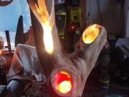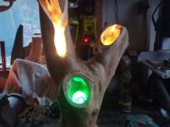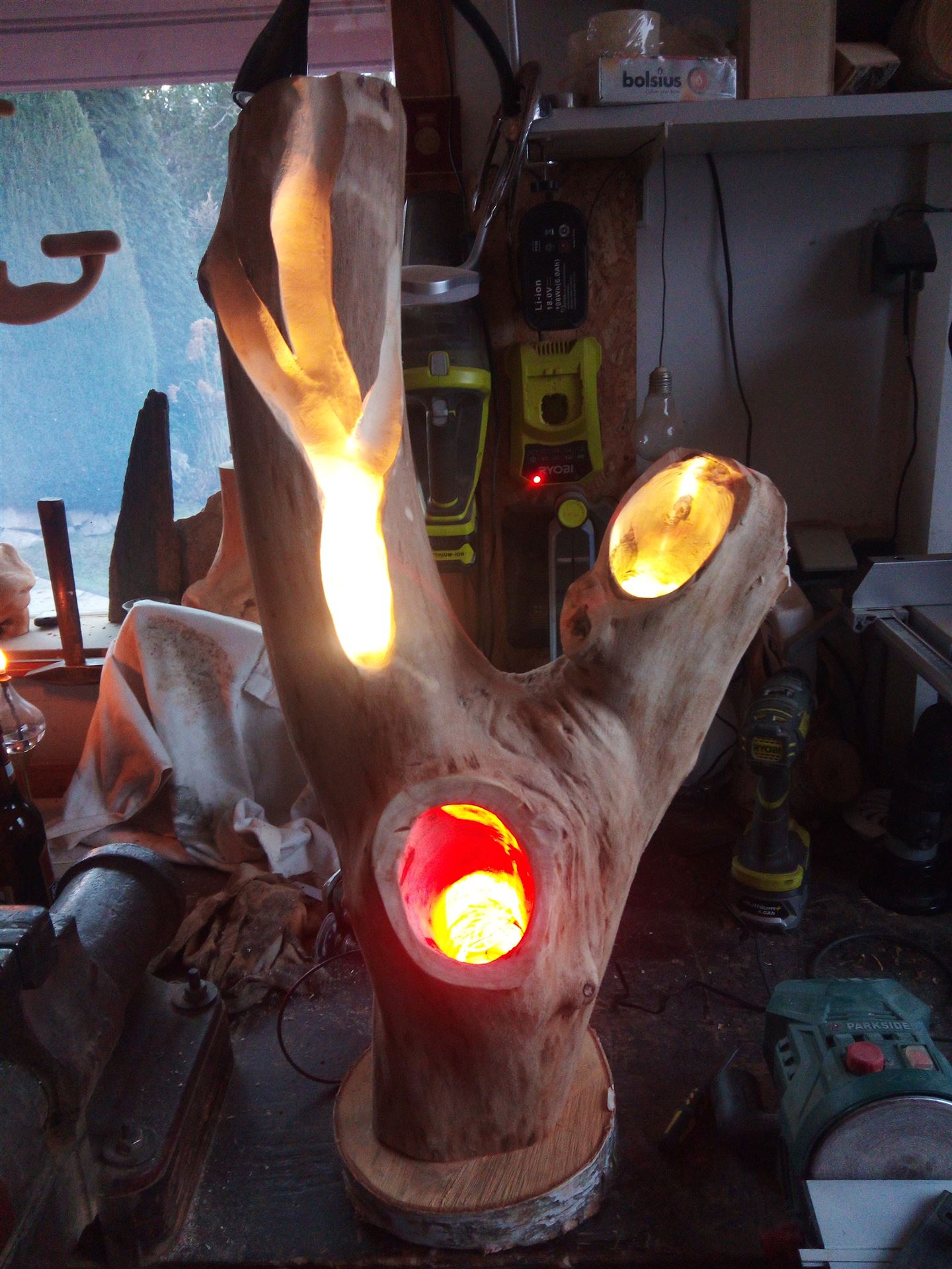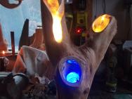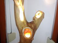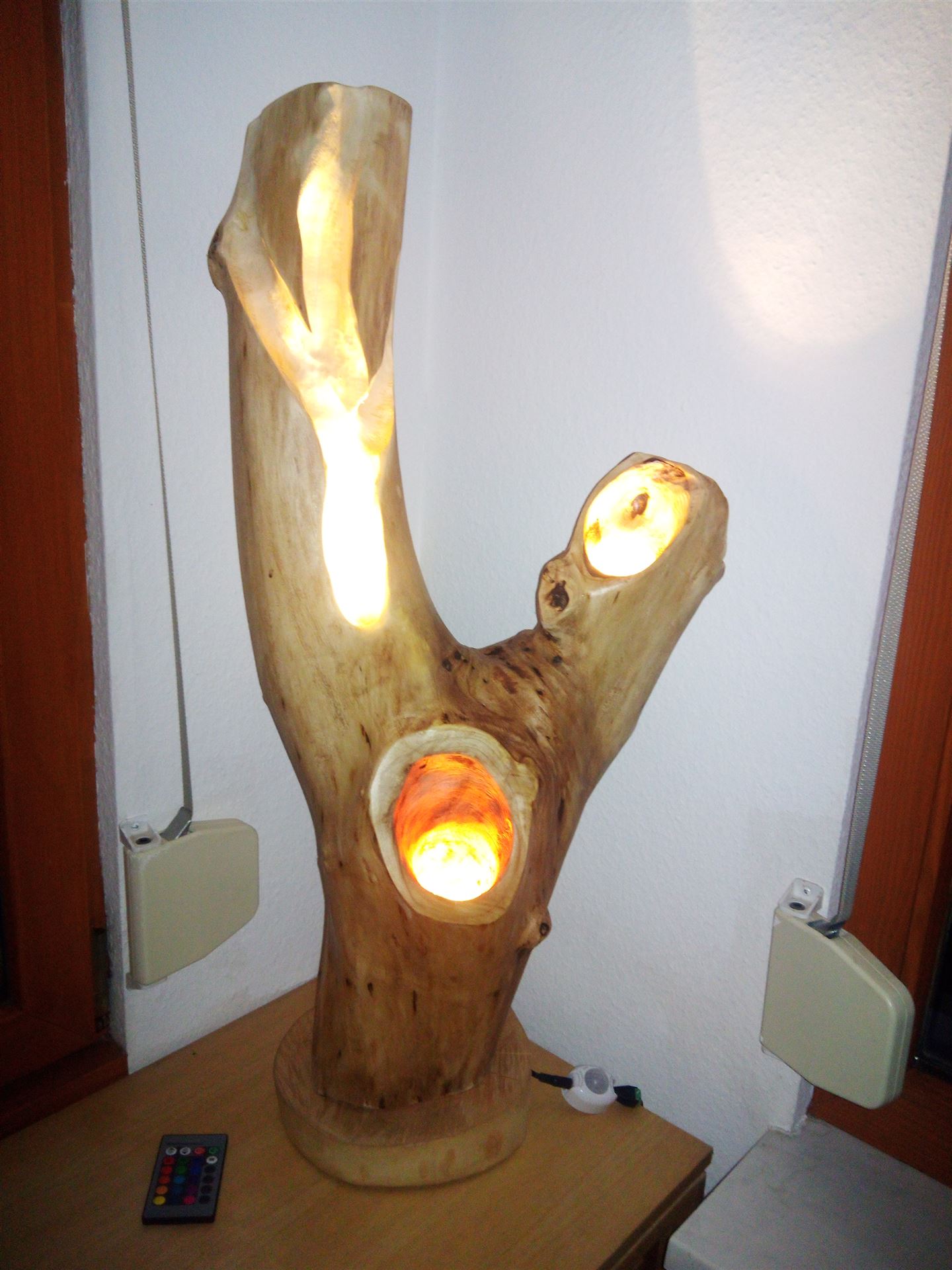 Diese Objekt wurde aus einem natürlich gewachsenen Nussbaumstamm gefertigt. Für stimmungsvolle Effekte sorgt die integrierte Beleuchtung. Die nach vorne ausgerichtete Astöffnung kann zusätzlich farblich unterschiedlich ausgeleuchtet und gedimmt werden.