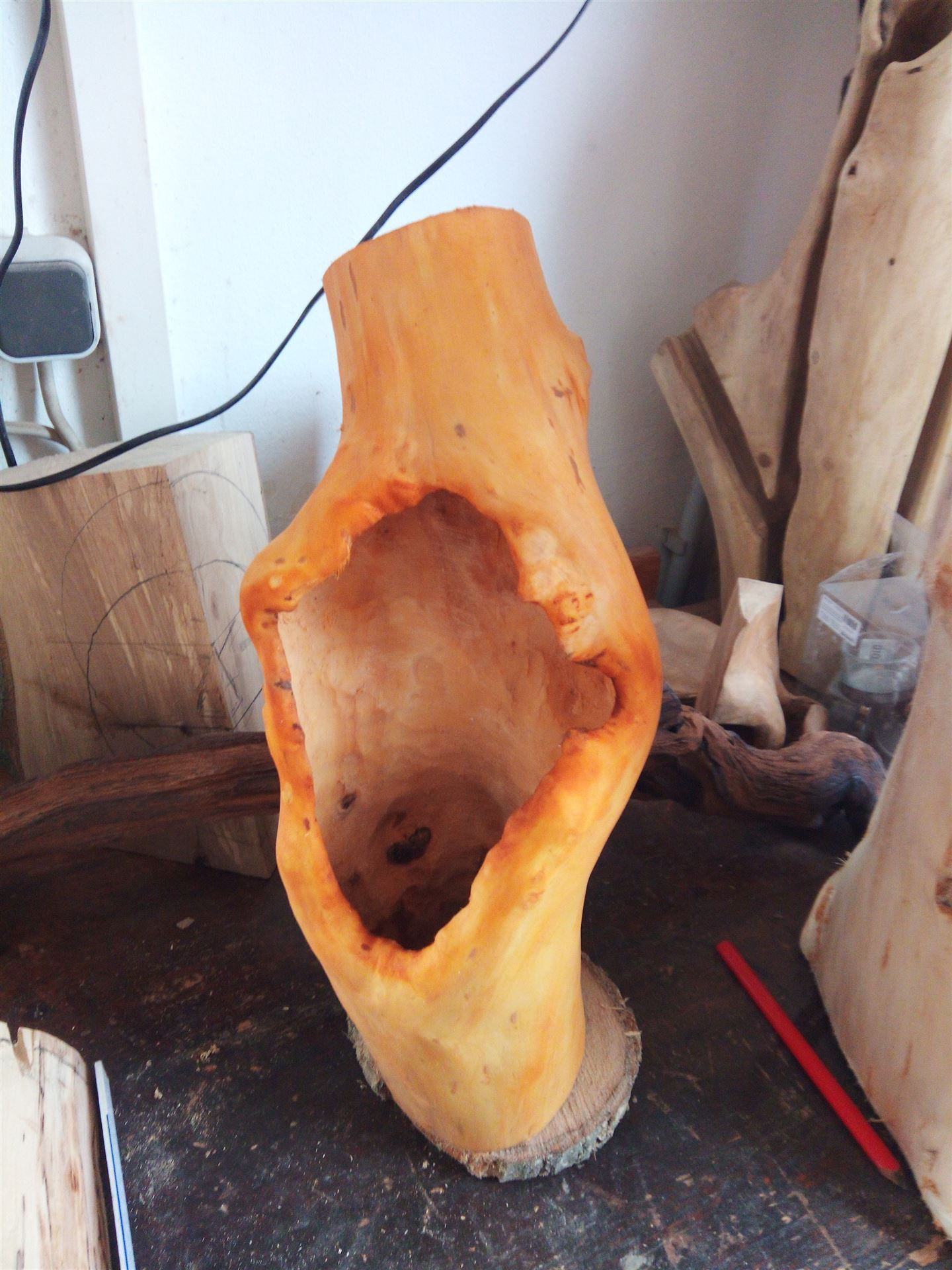 Diese Stimmungsleuchte wurde aus einem hohlen Apfelbaumast aufwendig gestaltet. Die indirekte Ausleuchtung erzeugt ein stimmungsvolles Licht.